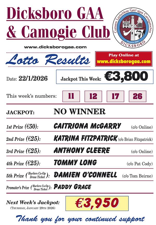 We encourage all Dicksboro families to sign up and play weekly for just €2 per draw and we thank everyone who is currently doing so.