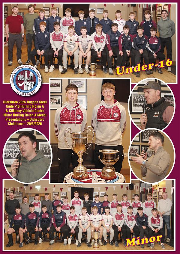 The Dicksboro 2025 Dugan Steel Under-16 Roinn A and the Kilkenny Vehicle Centre Minor Hurling Roinn A champions were presented with their medals in the Dicksboro GAA & Camogie Club clubhouse, Palmerstown on Friday last, 20th March.